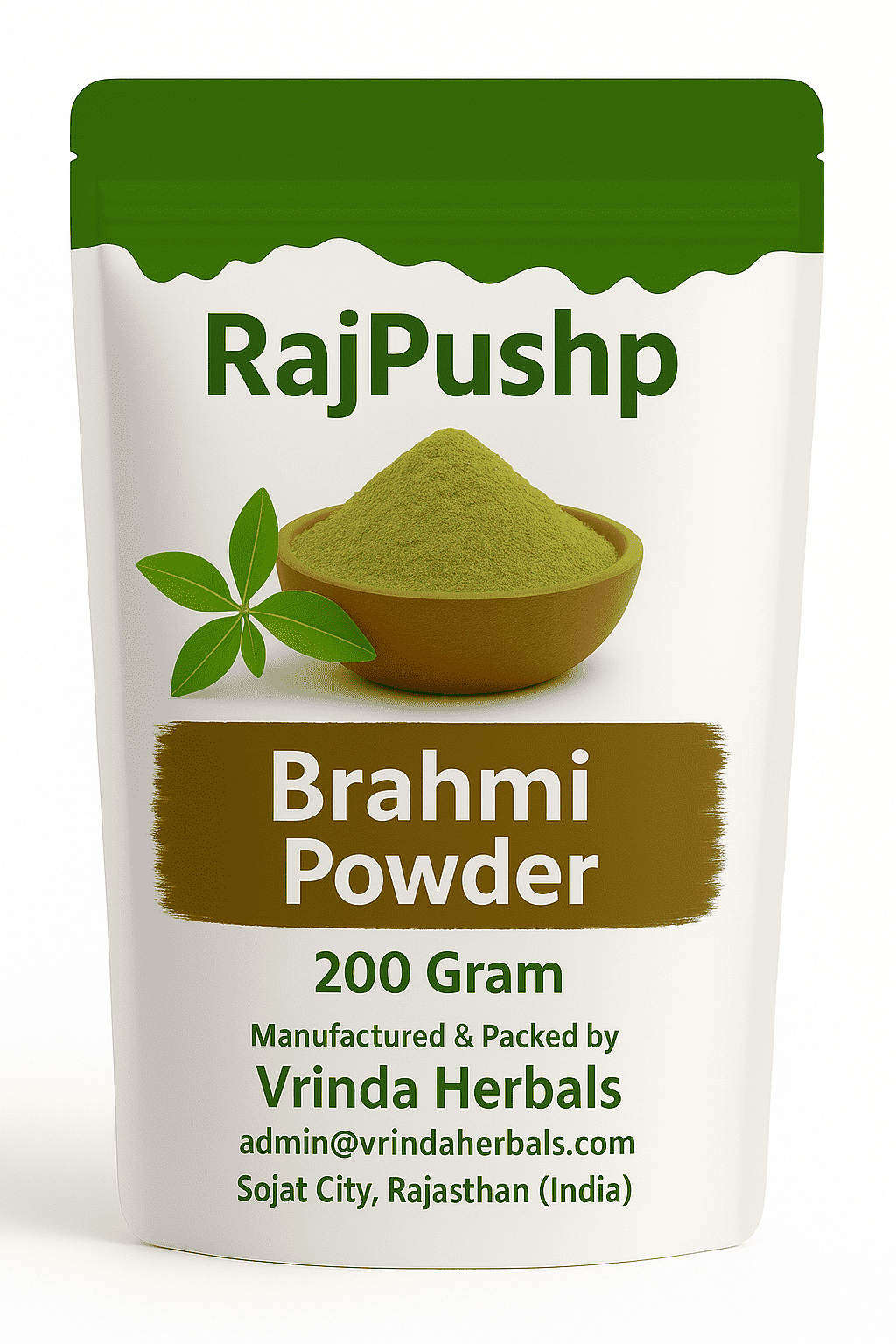 Unveil the ancient wisdom of Ayurveda with Vrinda Herbals Brahmi Powder, made from fresh and pure Brahmi (Bacopa Monnieri) leaves. Celebrated for centuries as a brain tonic, stress reliever, and rejuvenator, Brahmi not only sharpens the mind but also strengthens hair and nourishes the skin.